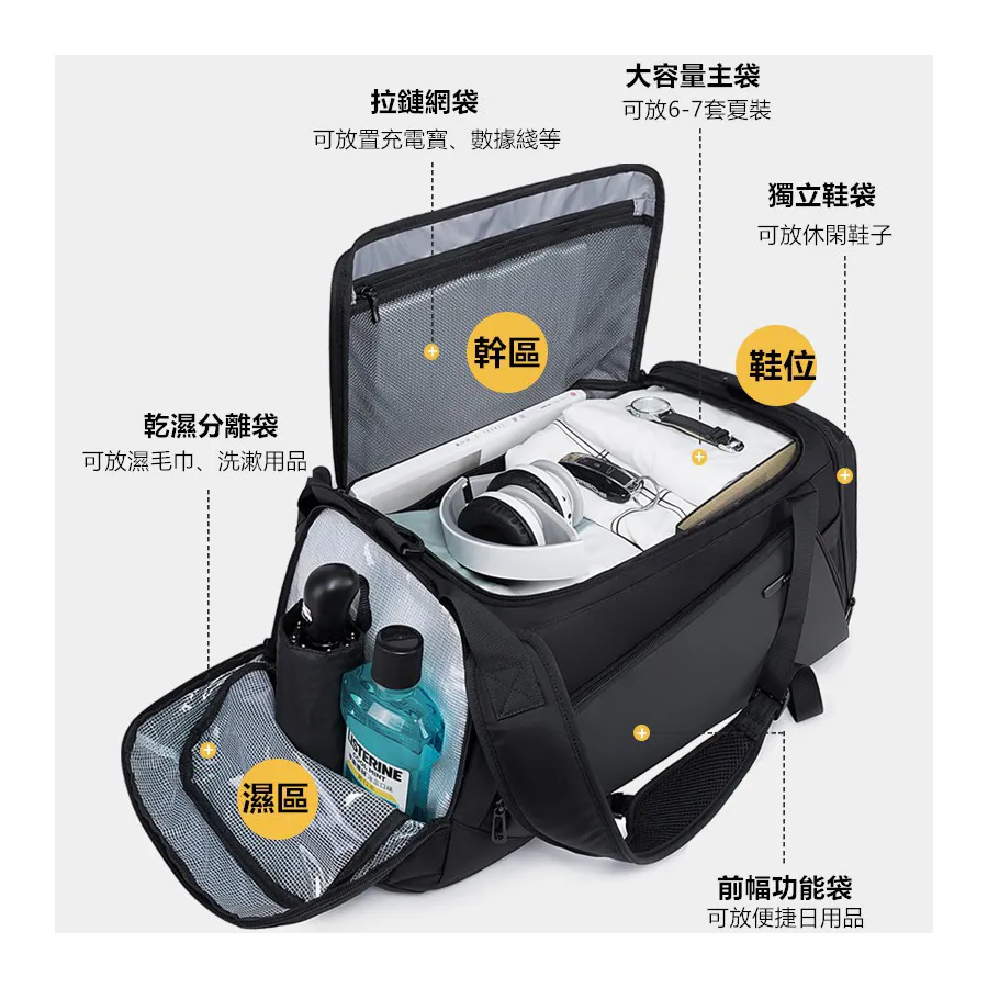 • Features: Multilayer space - Water proof material - Wear Resistant bottom - Bottle Pocket - Shoe Pocket with ventilation hole - SBS Zipper