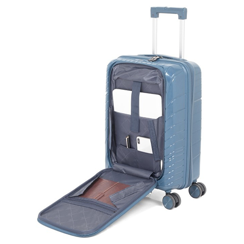 Blue textured hard cabin-sized trolley bag, secured with a number lock