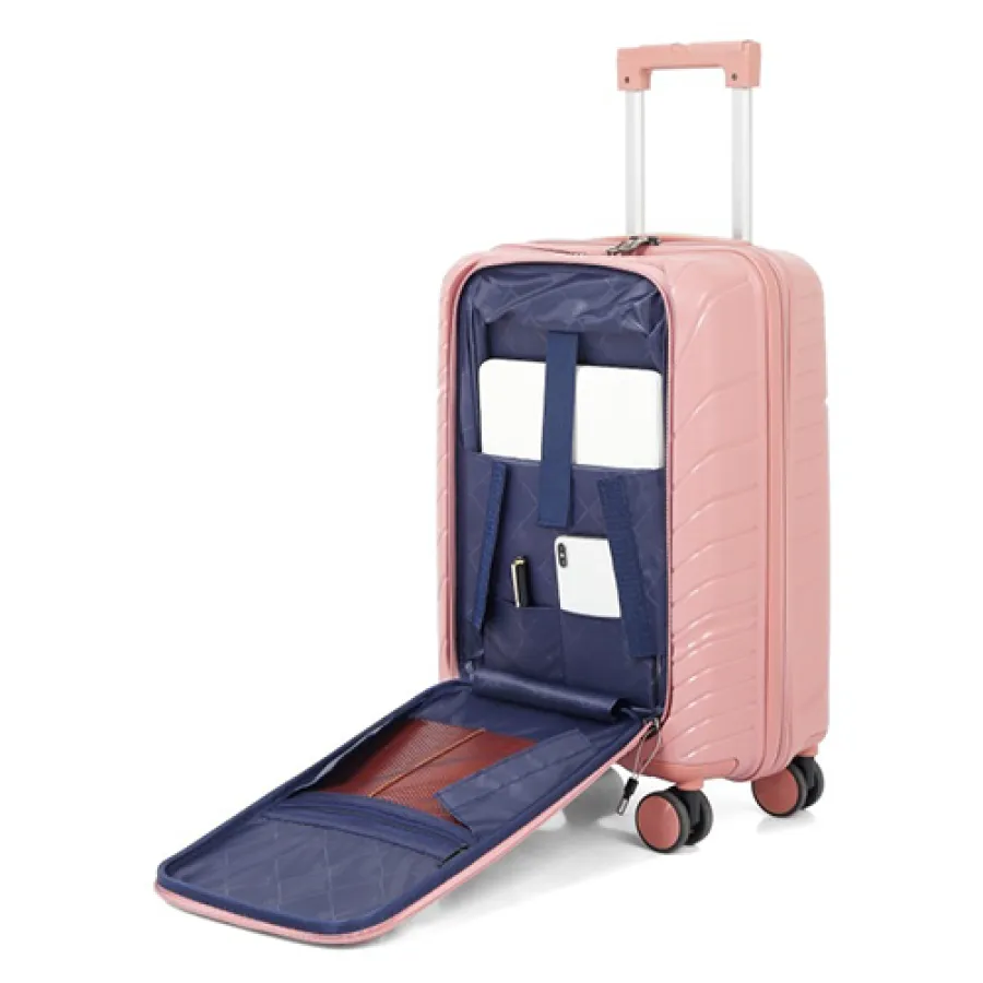 One handle on the top and one on the side, has a retractable handle on the top and eight 360-degree rotatable corner-mounted skate wheels