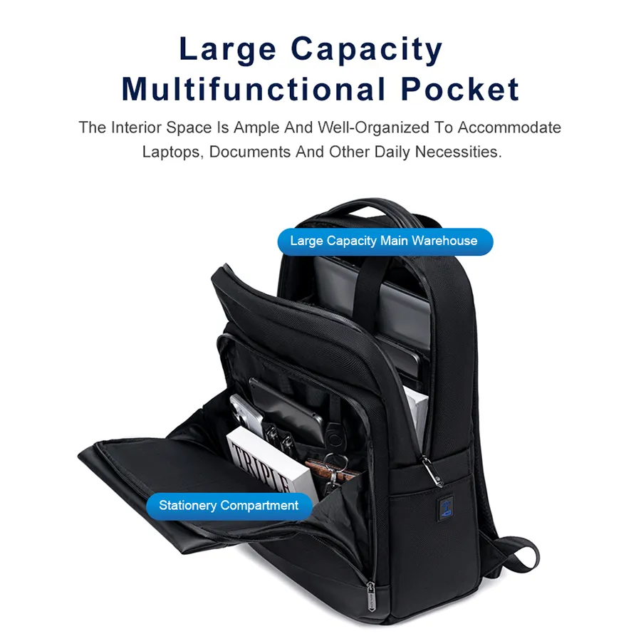 • Another compartment is on the front of the bag, which is equipped with 1 large pocket, 2 small pockets, 2 pen pockets, and 1 hook for hanging keys