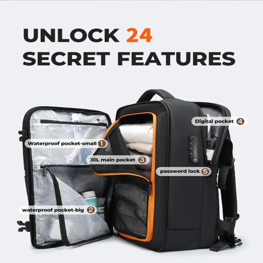 With 20+ awesome features, this backpack makes every journey comfortable and stress - free!Large capacity & multiple compartments keep items organized in this travel backpack!Wet-dry separation pocket for storing dry and wet items separately without messing up other items!With an anti-theft combination lock, the backpack lets you relax in crowded places!With an independent padded laptop compartment, your laptop's safe all the way on the go!Size: 30*15*48.5cm, fit 15.6inch laptop